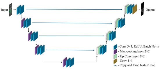 U-Net [] features a fully CNN with a U-shaped encoder–decoder framework. The input image of the encoder and the output image of the decoder have the same image size. The decoder is more or less symmetric than the encoder, and the encoder has a large feature channel for propagating contextual information to the high-resolution layer. The architecture includes two 3 × 3 Conv layers, each accompanied by a max-pooling (MP) layer of 2 × 2 kernel size, with stride 2, and a ReLU []. In the decoder, the tensor map was upsampled using a 2 × 2 up-convolution and concatenated with the encoder features. A final layer of 1 × 1 convolution was incorporated into the U-Net network. Figure 6 illustrates its architecture. Furthermore, the first stages of the encoder (including and before the first max-pooling layer as ) and decoder (first up Conv layer with subsequent layers having the same spatial dimensions as ) of the U-Net shown in Figure 6 are mathematically represented as follows: