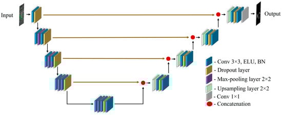 Modified U-Net [] is an updated variant of the U-Net, featuring an encoder–decoder framework. Like U-Net, the modified version includes two 3 × 3 Conv layers, each accompanied by an MP layer of 2 × 2 kernel size of stride 2, and an activation function named the exponential linear unit []. In the decoder, the tensor map is upsampled using a 2 × 2 up-convolution and concatenated with the encoder features. To overcome the overfitting issue, a dropout layer was placed between the Conv layers. A last layer with 1 × 1 Conv is used in the modified U-Net architecture. Moreover, the stochastic gradient descent optimization is replaced with the Adadelta algorithm. Figure 7 shows the structure of the modified U-Net. Furthermore, the first stages of the encoder (before and including the first pooling layer as ) and decoder (first up Conv layer with the subsequent layer including convolutions as ) of Figure 7 are mathematically expressed as follows: