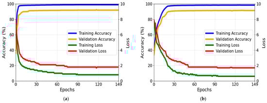 For Experiment 1, Dataset A was first used for training with 70% of the data. Dataset B, transformed using the proposed method, was subsequently divided into two equal portions: one serving as testing data and the other as small training data. A single image of the small training data was then augmented and used for training, whereas the testing data remained unchanged. In Experiment 2, 70% of the data in Dataset B were used for training. Next, the data were preprocessed, and Dataset A was subsequently divided into two equal portions: one serving as testing data and the other as small training data. We augmented a single image of the small training data and further utilized it for training, while the test data remained unchanged. During training, the images underwent resizing to a resolution of 512 × 512 pixels, and the network was trained using a batch size of two for 150 epochs. We employed an Adam optimizer [] with an initial learning rate (LR) of 1 × 10−5 and utilized a cosine annealing strategy [] to steadily reduce the LR during training. The training loss was calculated using dice loss []. We trained the proposed framework using the U-Net, modified U-Net, and CED-Net architectures. Figure 9 depicts the loss and training graphs for the BoniRob dataset and the CWFID using U-Net. Furthermore, the convergence of the loss and accuracy curves of the validation and training data demonstrates that the network is adequately trained and avoids overfitting.