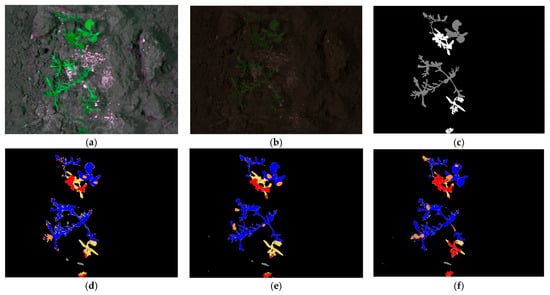 Visual representation of crops and weeds with samples from the BoniRob dataset for estimating FD values: (a) whole segmentation results; (b) weed segmentation result; and (c) crop segmentation result.
