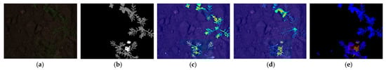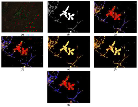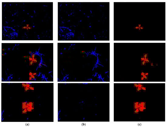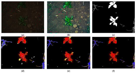 We also analyzed the semantic segmentation performance using the proposed method with U-Net based on gradient-weighted class activation mapping (Grad-CAM) [], as depicted in Figure 17. Grad-CAM typically depicts important features as reddish and yellowish colors, whereas unimportant features are shown in bluish colors as explainable artificial intelligence. Figure 17 shows the Grad-CAM image, obtained after the fourth convolution layer of U-Net, illustrating the accurate extraction of crucial features for crop and weed segmentation, confirming that our method can generate correct images in heterogeneous datasets for the accurate segmentation of crops and weeds.