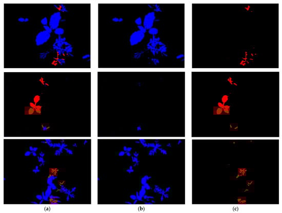 Figure 18 shows examples of incorrect segmentation using the proposed method with U-Net. In this illustration, red pixels represent the TP of crops, black pixels represent the TP of the background, and blue pixels signify the TP of the weed. Yellow pixels represent errors where crops were mistakenly identified as background or weeds, while orange pixels represent errors where weeds were mistakenly identified as background or crops. Gray pixels indicate errors where the background was mistakenly identified as weeds or crops. The reason for the incorrect segmentation is that crops and weeds have similar shapes and colors, making them hard to distinguish, especially in cases where objects possess thin regions.