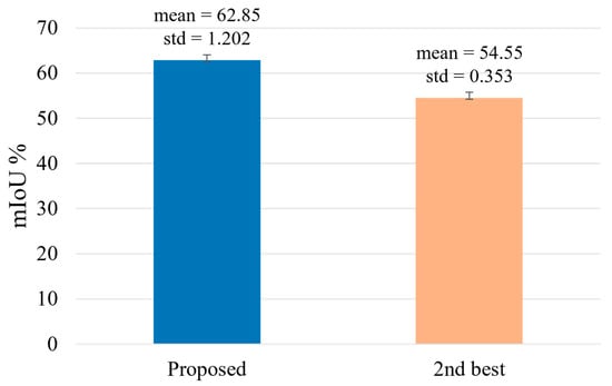 We performed statistical analysis using the Student’s t-test [] and calculated the Cohen’s d-value []. For this purpose, we calculated the mean and std of the mIoU using our method with U-Net, as shown in Table 7 and Table 11, respectively. Additionally, we calculated the mean and std of the mIoU using the second-best method (Pitie et al. []) with U-Net, as presented in Table 7 and Table 11. The measured p-value is 0.041, showing a confidence level of 95% with a significant difference, as depicted in Figure 16, and Cohen’s d-value is 0.936, representing a large effect size. This confirms that the proposed framework statistically surpasses the second-best method and achieves higher segmentation accuracy.