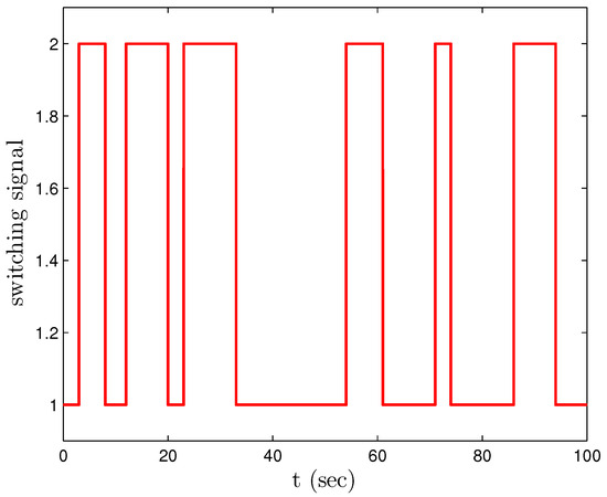 - Local Plant Rule i: If is and … is , thenwhere ; is a classical set, which means that the system, over interval , only belongs to a certain Region j. That is, the switching subsystem j is active over . Regions j are the mutually disjoint regions. The union of all regions forms the universe of discourse; each Region j corresponds to each switching subsystem j. All switching subsystems constitute a switching system; region rules describe how the system switches, and local plant rules describe the fuzzy plant rule under each switching subsystem; ; and are premise variables and the membership functions, respectively; represents the state of system; represents the network measurement; represents the estimated signal; represents the nonlinear activation function; represents the noise input; represents the initial function on . , , , , , , , and are constant matrices; represents delay, the condition and hold, where and are constant scalars; the switching instant satisfies , .