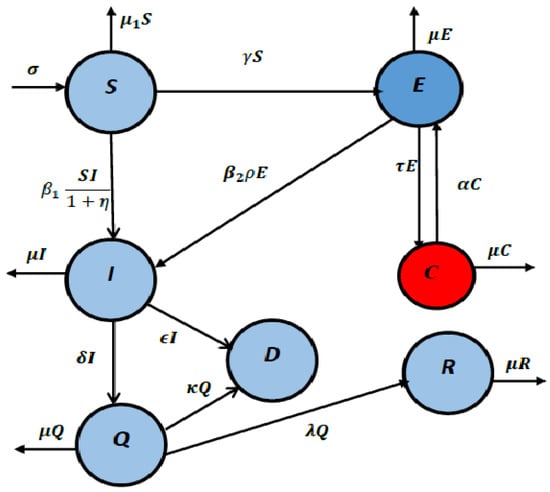 Here, the notation is used for the piecewise fractional-order derivative with order . Table 1 describes the compartments and nomenclature of model (2).