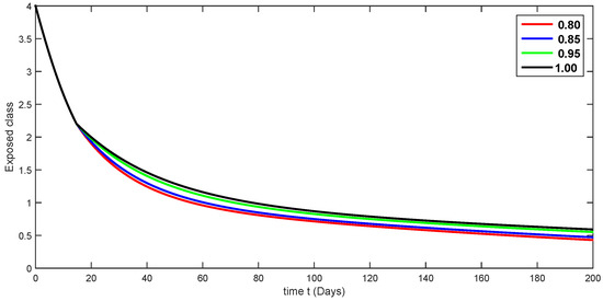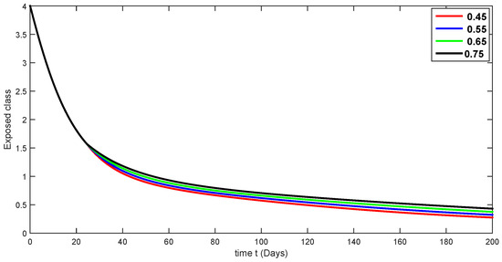 Fractional-order dynamical behaviors of the exposed class of the proposed model (4) using various fractional-order values in .