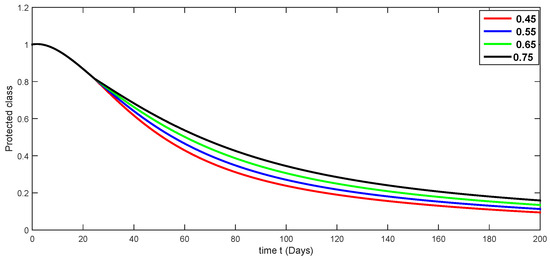 Fractional-order dynamical behaviors of the susceptible class of the proposed model (4) using various fractional-order values in .