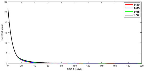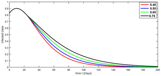 Fractional-order dynamical behaviors of the infected class of the proposed model (4) using various fractional-order values in .