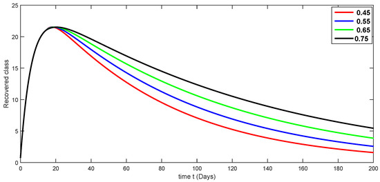 Fractional-order dynamical behaviors of the recovered class of the proposed model (4) using various fractional-order values in .