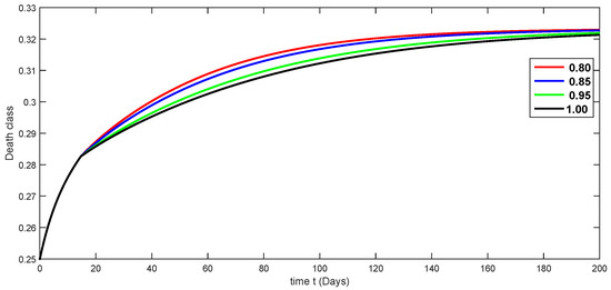 Fractional-order dynamical behaviors of the death class of the proposed model (4) using various fractional-order values in .
