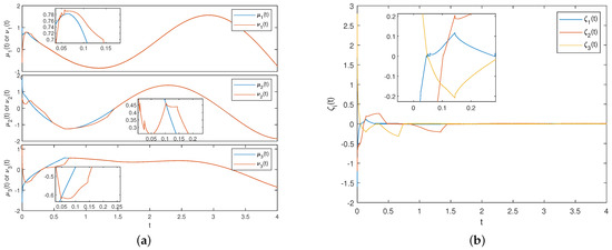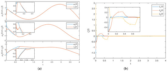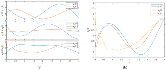 and . The initial conditions of system (35) are . In the driven system for system (35), we define that the jump threshold . The initial conditions are . Figure 2 shows the neurons’ trajectory plots of the driven and response FMNNs, as well as the error FMNNs, without the effect of the controller. The neurons’ trajectories of the driven–response FMNNs do not overlap in Figure 2a, and the ones in the error FMNNs exhibit sustained oscillations in Figure 2b, which indicate the absence of asymptotic synchronization between the driven–response systems without control intervention. In the following, the choice of appropriate controller parameters will enable the systems to achieve asymptotic synchronization.