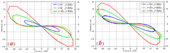 Hysteresis loop characteristics of a memristor analog circuit. (a) Varying with amplitude v. (b) Varying with frequency f.