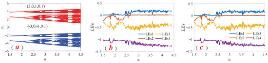 and (−3, 0, −1, 0.1), represented in red and blue, respectively, the bifurcation path in Figure 10a appears in a period-doubling manner. Further analyses of the coexistence bifurcation diagram and the LEs in Figure 10b,c reveal the same dynamic behavior.