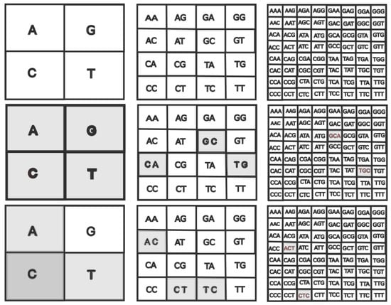 The FCGR for dimers, achieved with a pixelization level of , is generated through a process where each quadrant is further divided into four analogous subquadrants. This division is depicted in the top-middle row of Figure 1. Within a given quadrant, these four subquadrants encompass sequences that conclude with a specific dimer and only vary in the last nucleotide. Like in the monomer case, the frequencies within each subquadrant are computed and exhibited by varying the gray intensity levels. For example, in the scenarios of the sequences “TGCA” and “ACTC”, the FCGR tables for are portrayed in the middle column, middle row, and bottom row of Figure 1, respectively.