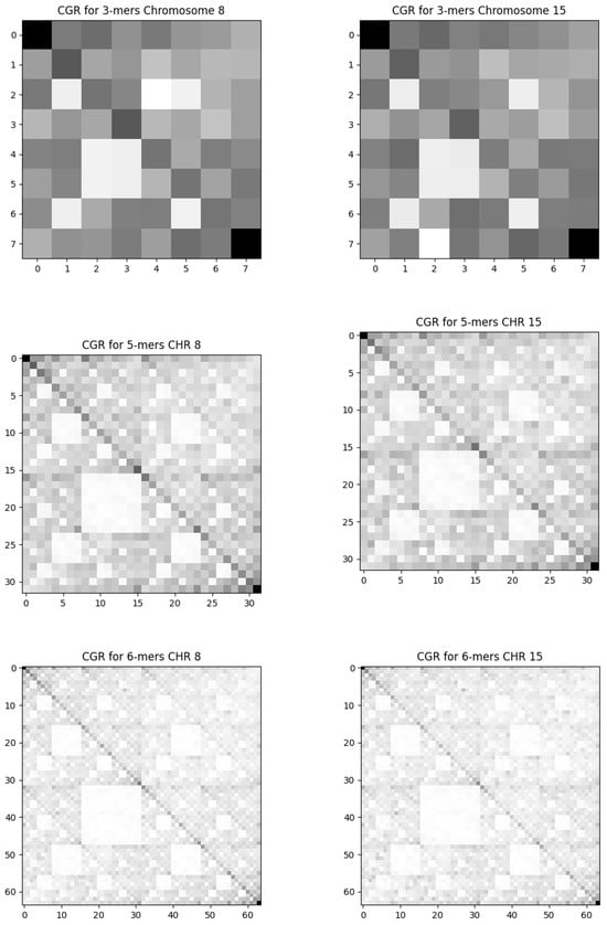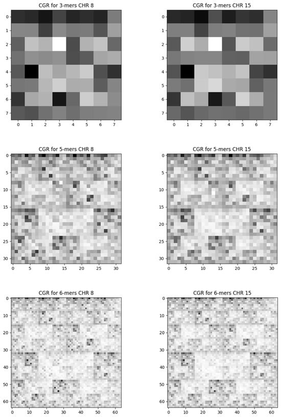 CGR is significant in assessing the prevalence of k-mers within nucleotide sequences, with k being an adaptable integer of your choice. Each k-mer corresponds to a distinct sequence of length k from the DNA sequence, which facilitates the identification of specific regions within biomolecules such as DNA (for gene prediction) or proteins []. In the scientific realm, this technique is recognized as Frequency Chaos Game Representation (FCGR), enabling the visualization of k-mer frequencies in a given sequence through an image format. In this imagery, each pixel corresponds to a distinct k-mer []. The expansion of CGR to FCGR has ushered in novel approaches for sequence comparison and phylogenetic analysis [,,].