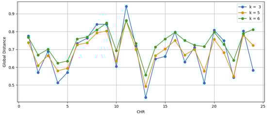 Our analysis of chromosome similarity, conducted through Equation (2), revealed fundamental information about genomic organization and composition at different resolution levels. The similarity d between the two data sets is shown in Figure 4 and Table S2. Each column corresponds to the similarity between the chromosome of the entire sequence set and the same chromosome of the exon sequences, calculated on one of the scales . By calculating the distance between these two data sets at different scales, we can discern how the distribution of k-mers varies across each. Our results show that the absence of nonexon regions does not significantly alter the distribution of k-mers in sequences. The chromosome that presents the most significant variation in k is the Y chromosome.