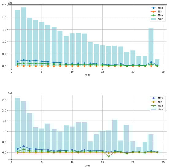 Time series measurements are represented by mapping the four nitrogenous bases (A, C, G, T) into four discrete values (). The column of bars shows the number of points (size) in each time series. Line charts display the maximum (max), minimum (min), and mean (mean) values of the time series. It is observed that the maximum, minimum, and average values are significantly smaller compared with the total number of points. At the top, we have the measurements for the complete sequence; at the bottom figure, we have the measurements for the exons. The X and Y chromosomes occupy positions 23 and 24 on the “CHR” axis. The numerical values are in Table S1 (See Supplementary Files).