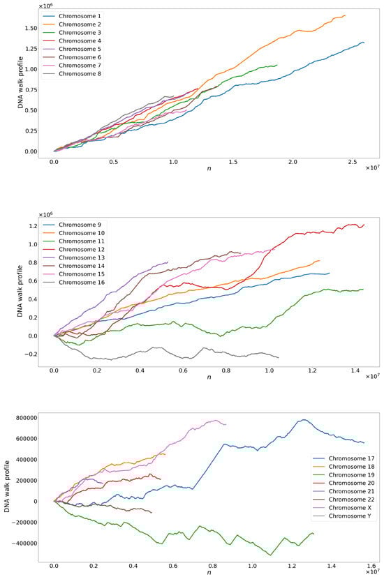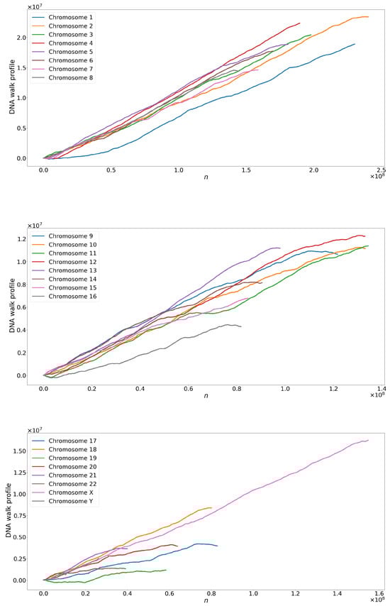 We used the database available from NCBI [] to investigate the base pair sequence properties of human DNA. To carry out this investigation, we divided human DNA into two groups: The first, composed of the 24 chromosomes, comprises all the base pairs that form the DNA sequence, considering all the regions that form DNA: exons, introns, intergenic, etc. The second group also comprises the 24 chromosomes, but the DNA sequences rely only on the exons’ presence. Then, we apply all the methods and tools described in Section 2 to both sets.