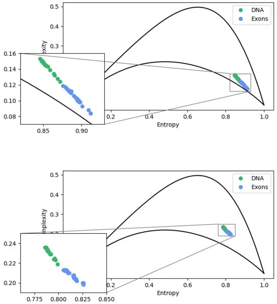 First, we compute the statistical complexity and entropy for scaling segments and . For exons, we obtain and , and for the complete sequences, and . The entropy–complexity plane for this condition is shown in Figure 8. Note that there is a very sharp separation between the two sets. Both sets have high entropy and low statistical complexity, indicating that the time series generated from these base pair sequences are stochastic. This means that the time series exhibits variations and fluctuations that appear random and the evolution of the data over time cannot be described by an exact deterministic relationship. The future course of the series is uncertain and can only be described in terms of probability distributions.