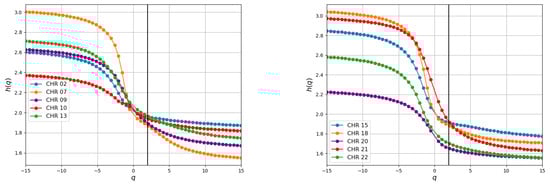 For coding human chromosomes selected at random, the generalized Hurst exponents are displayed. Comparable behaviors are noted in the remaining chromosomes. The values are made easier to see by the vertical line at .