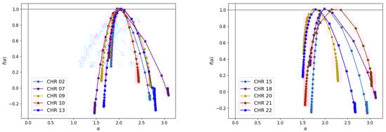 As can be seen in Figure 10, the multifractal spectra derived from Equation (15) show concave behavior with maximum values at the scaling indices . The degree of multifractality is measured by the width of ; a wider width denotes more heterogeneity in the fractal, suggesting more complexity in the process of generating the investigated series and more difficulty in making predictions, and vice versa. Chromosomes exhibit the highest variation in compared with other chromosomes, while display the lowest, as indicated in the table.