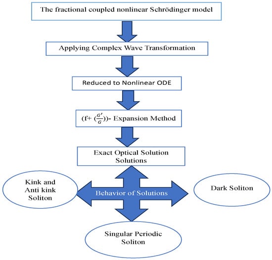 where and are the real functions, is a complex function of time t and x. The parameters are the fractional order of derivatives having values . Moreover Equations (1)–(3) describe non-relativistic quantum mechanical behavior and nonlinear media. The main idea of this study is shown in Figure 1. The present study is distributed into different sections. In Section 2, we present the beta derivative and the description of the algorithm. Section 3 presents the optical solitary wave solution of the considered model. Section 4 presents the chaotic analysis and Section 5 presents the sensitivity analysis. The results attained through -expansion algorithm will be analyzed graphically in Section 6. The conclusion is presented in Section 7.
