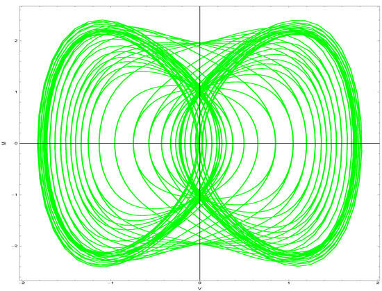 where represents the frequency and interprets the intensity of the perturbed factor. The two-dimensional phase graph of the dynamical system (40) utilizes different values of parameters , as shown in Figure 2 and Figure 3.