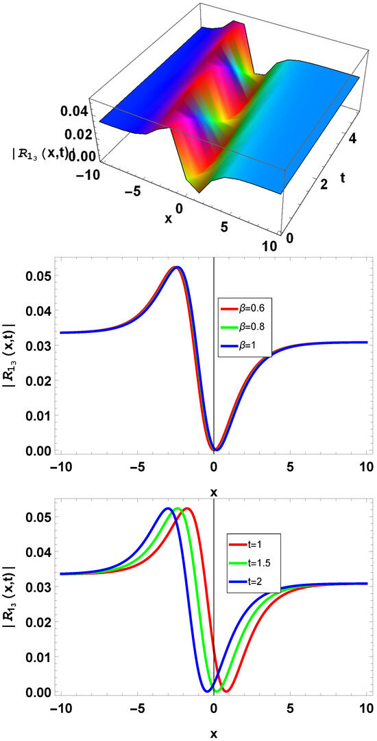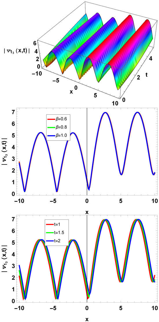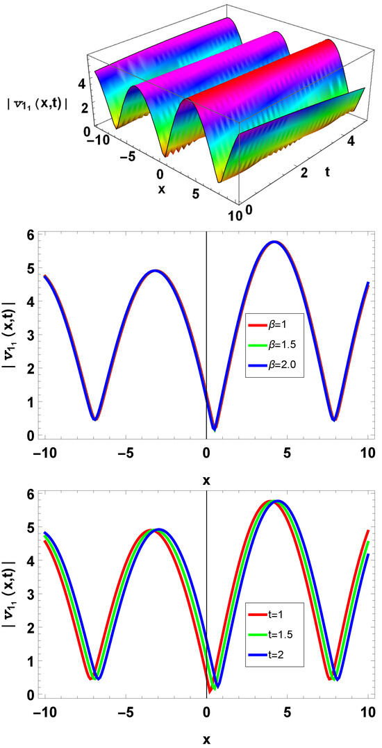 In the 2D graph, there is a blue line for , a black line for , a red line for , a blue line for , a black line for , and a red line for . In the 2D graph, we observed that when the value of t increases, amplitude decreases, and amplitude increases when the value of t decreases. Similarly, by increasing the value of the beta amplitude, it decreases; otherwise, it increases. The fractional parameter value is the same in each 3D plot.