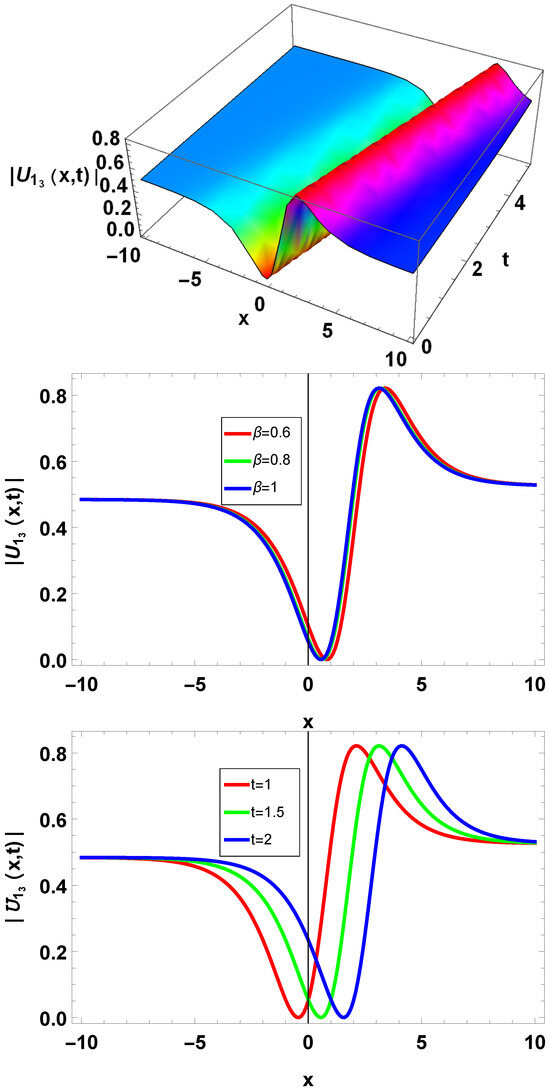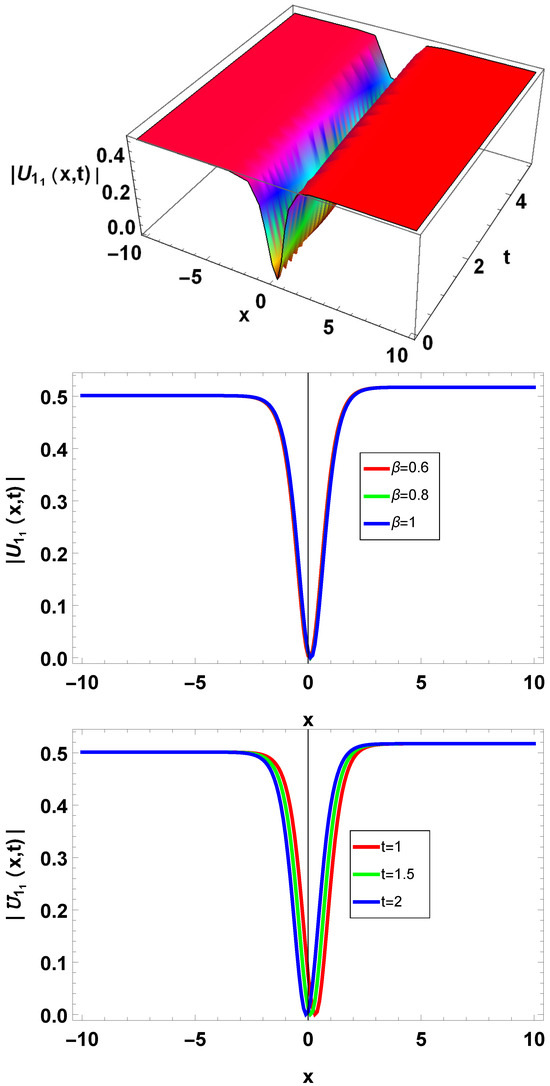 Figure 9. Dark-type optical waves of (29) with parameters , . - Figure 10 and Figure 11 present the kink and anti-kink waves. Kinks are localized disturbances or “bumps” that occur within a medium. Anti-kinks are identical to kinks but illustrate transitions in the opposite approach. They also apply a sharp change in the field value (but in the opposite direction approximated to kinks). Anti-kink waves can be considered localized “dips” or “depressions” in the field profile.
