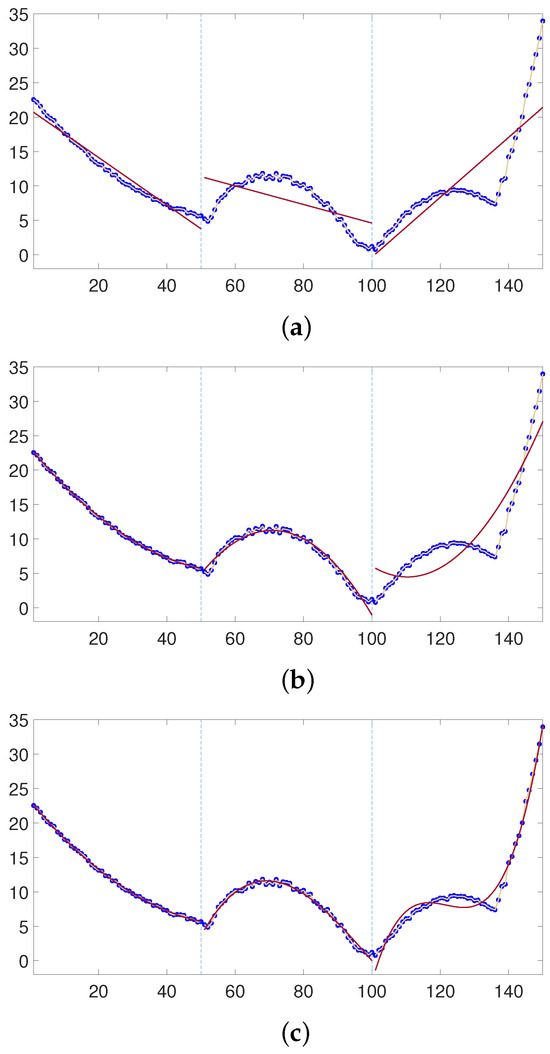 Least squares fitting for different orders. The blue dots indicate the original data, and the red lines imply the fitting data. (a): The number of least-squares fitting for each segment is 1; (b): The number of least-squares fitting for each segment is 2; (c): The number of least-squares fits for each segment is 3.