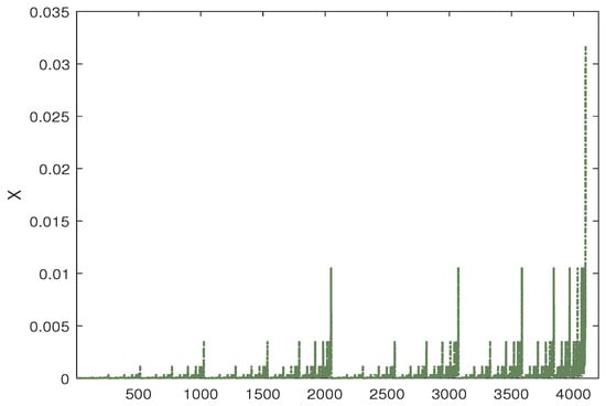 We define the length of the multiplicative cascades time series as N, where N equals , and is a positive integer. denotes the number of 1’s in binary form. In this paper, we set and the initial , which is shown in Figure 3.