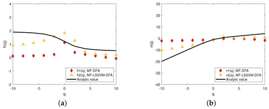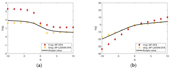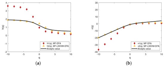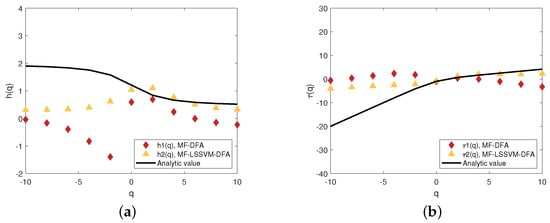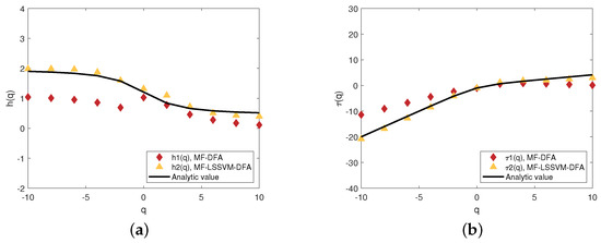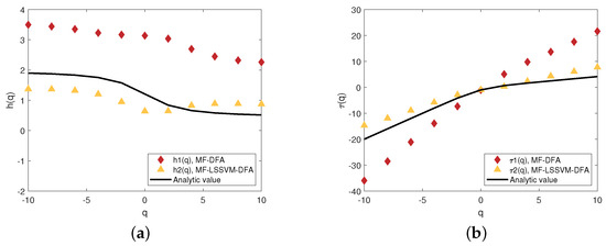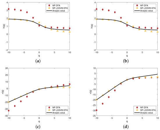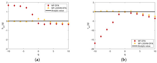 Figure 4, ⧫ represents the values calculated by MF-DFA, ▴ shows the values calculated by MF-LSSVM-DFA. The black line is the analytical value. It is obvious that when q ⩾ 0, the generalized Hurst exponent and the scaling exponent calculated by MF-LSSVM-DFA are closer to the analytical values than those calculated by MF-DFA. It is obvious that the generalized Hurst exponent and the scaling exponent calculated by the MF-LSSVM-DFA method are closer to the analtical solution than those calculated by the MF-DFA method, implying that the MF-LSSVM-DFA method performs better than the MF-DFA method.
