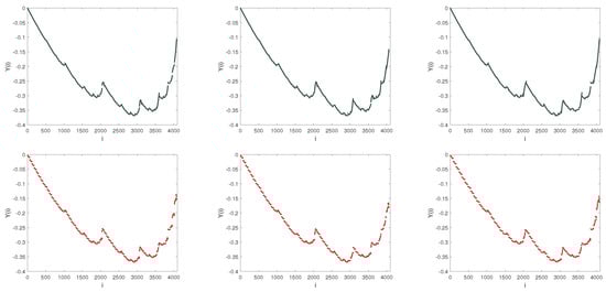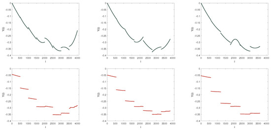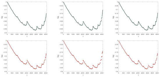 To highlight the effectiveness of the proposed method, we compare it with existing improved MF-DFA methods. Yang et al. [42] addressed the potential presence of negative values in the original MF-DFA model by introducing sign retention to enhance performance, resulting in the sign retention model MF-S-DFA. Additionally, Wang et al. [43] proposed the MF-LF-DFA algorithm, which improves the performance of MF-DFA by reasonably setting the fitting order for different local intervals based on the fluctuation characteristics of the sequence. We calculate the Hurst values corresponding to different ranges of s. Let and denote the absolute differences between the results computed using MF-S-DFA and LF-MF-DFA methods and the analytical values, respectively. The final results are presented in Table 5. Comparing the averages of and in each range of s with those in Table 2, we find that the proposed method achieves better performance compared to the two existing improved MF-DFA methods.