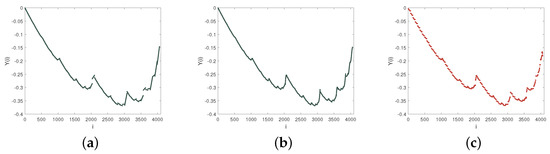 It is obvious that when the fitting order equals 1, the second segment and the third segments are underfitting. When the number of the fit is 2, although the fitting results of the second segment are good, the first segment presents an overfitting performance and the last segment is underfitting. Figure 2c shows that when x belongs to [0, 100], the fit is overfitting. Therefore, when the fitting order of the nonlinear time series is single, the fitting performance of some segments of the time series is disappointing. Therefore, we replace the polynomial fitting function with LSSVM in the MF-DFA method. That is, replace Equation (2) with Equation (14). Equations (3) and (4) are updated as follows: When ,