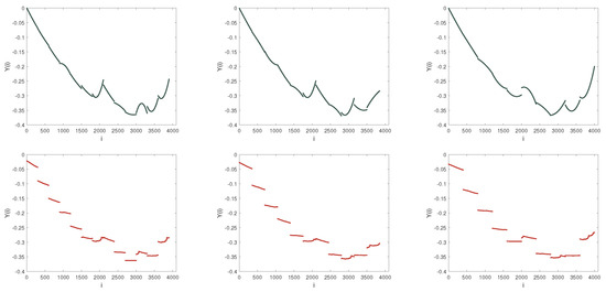 Fitting forms of dispersion sequence. From top to bottom, the adopted models are MF-DFA (Black color) and MF-LSSVM-DFA (Red color), respectively. From left to right, s = 300, 350, 400, respectively. Fitting order is set by 2 in the MF-DFA.