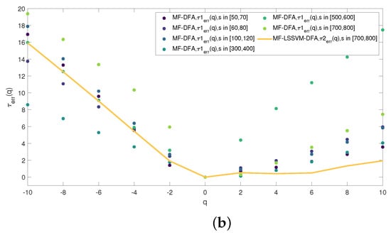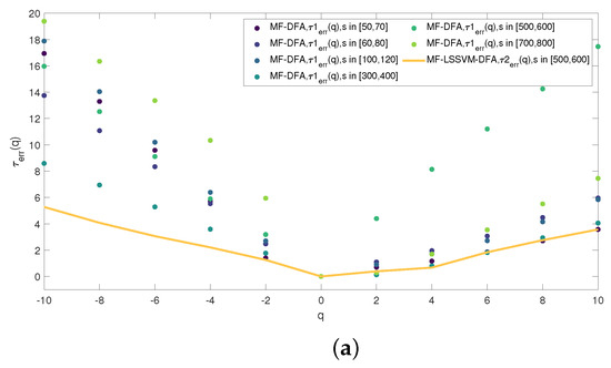 Figure 18 presents the distribution of the scaling exponents. From Figure 18a, we find that when q is the same, the scaling exponent obtained by MF-LSSVM-DFA when s is in [500, 600] is almost smaller than that calculated by MF-DFA, regardless of the interval of s. When the interval of s becomes larger where the minimum s is far larger than , and is still closer to the analytic value than when s belongs to [50, 70] and [300, 400]. Therefore, our proposed model has smaller restrictions on the window size s.