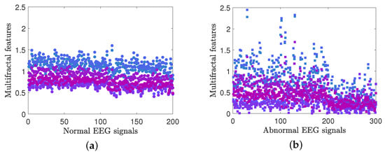 (a,b) The generalized Hurst indices were extracted from EEG signal data based on MF-LSSVM-DFA for healthy persons and epileptic patients, respectively.