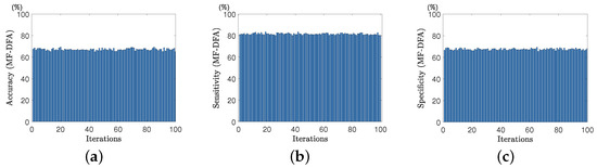 Evaluation metrics for EEG signal classification based on the MF-LSSVM-DFA algorithm: (a) accuracy, (b) sensitivity, and (c) specificity.