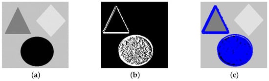 Simple synthesized image segmentation by MF-LSSVM-DFA method of (a) original image, (b) mask (White color), and (c) segmented state (Blue color).
