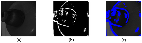 Hyperspectral insulator image segmentation by MF-LSSVM-DFA method of (a) original image, (b) mask (White color), and (c) segmented state (Blue color).