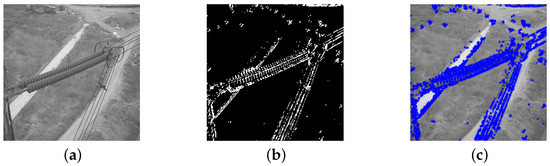 Outdoor transmission tower image segmentation by MF-LSSVM-DFA method of (a) original image, (b) mask (White color), and (c) segmented state (Blue color).