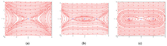 By selecting the fixed value of the parameters , we detect that the equilibrium position stands for a center point, and equilibrium position together with stand for saddle points, which is displayed in Figure 1b.