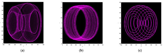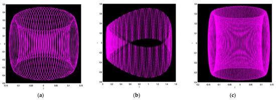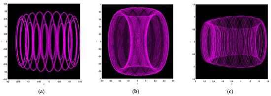 where and stand for the amplitude and frequency of the dynamical system in Equation (44). The impact of the perturbed term on the dynamic structure stated above is analyzed in the subsequent figures. In this instance, we identify the chaotic nature of the recommended dynamical system and illustrate the phase portraits of this system for several values of the parameters: in Figure 2a, ; Figure 2b, ; Figure 2c, ; Figure 3a, ; Figure 3b, ; Figure 3c, ; Figure 4a, ; Figure 4b, ; and Figure 4c, . Upon examining the provided figures, we observe highly complex and attractive behaviors. We detect the ringlet dynamics in Figure 2a,b and Figure 4a,c, besides those in Figure 2c and Figure 4b; we also see the complex dynamics. In a similar way, one can observe the periodic nature in Figure 3a as well as Figure 3b together with Figure 3c, which show the surprising periodic nature. This improved conception of the system’s sensitivity to fluctuations in parameters aid us in accomplishing the complex interactions among the frequency , the perturbation term, as well the dynamics of the system. The inference from this analysis allows us to launch a strong and progressive mathematical structure.