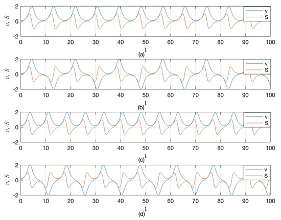 Sensitivity analysis of the proposed system with several initial conditions along with the parameters values : (a) and , (b) and , (c) and , (d) and .