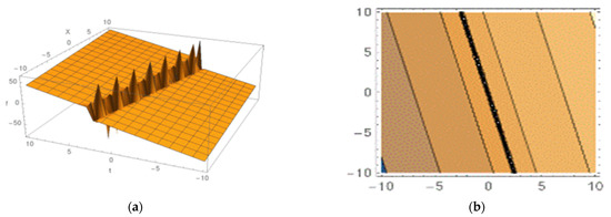 Singular soliton obtained from Equation (30): (a) 3D structure and (b) the contour shape.