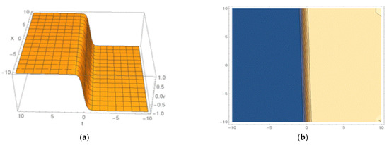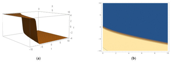 Kink-shaped soliton found by Equation (31): (a) 3D structure and (b) the contour shape.
