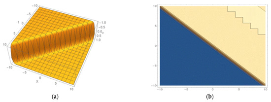 Kink-shaped soliton of Equation (29): (a) 3D structure and (b) the contour shape.