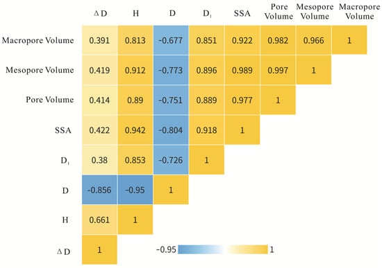- During the maturation process of shale, changes occur in the pore characteristics due to the conversion of organic matter and hydrocarbon generation, resulting in alterations in the heterogeneity of the pore structure. The distribution of the total pore volume spans from 0.005 cm3/g to 0.0116 cm3/g, while the specific surface area (SSA) ranges from 0.8345 to 2.2188. Mesopore volume fluctuates between 0.00821 cm3/g and 0.00347 cm3/g, whereas macropore volume varies from 0.00342 cm3/g to 0.00154 cm3/g. The trends of SSA, total pore volume, and mesopore volume exhibit similarity, with minimal volatility observed in the macropore volume. The distribution ranges of ΔD and D are 1.1883 to 1.3 and 2.46 to 2.4995, respectively, indicating opposite trends. With increasing pyrolysis temperature, both D1 and H gradually decrease, with ranges of 0.859 to 0.829 and 0.85 to 0.86355, respectively. These findings suggest that the pyrolysis process ultimately results in a more dispersed distribution of shale pore sizes and diminishes the connectivity among pores.
