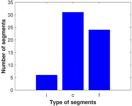 The segment analysis of the Golding–Cox trajectories shows that about half of the trajectories (thirteen) are single-segmented, five trajectories are two-segmented, four are three-segmented, two trajectories each have either four or five segments, and one trajectory is eight-segmented (see the histogram in Figure 1). Depending on the diffusive type, each segment will be designated by the first letter of its name: ‘i’ indicates immobile, ‘c’ denotes confined, and ‘f’ is free. Such classification indicates the most common diffusive modes among segments (Figure 2). The number of confined segments (31) predominates, free segments are slightly smaller (24), and there are only six immobile segments. The confined diffusion segments can be presented by the following types of statistics: Gaussian, Laplace, and Linnik ones (Table 2). The distributions of the two last types produce jump-like stochastic processes []. It should also be noticed that the confined diffusion modes may be different in statistics for each coordinate. The analysis of confined segments for the Golding–Cox trajectories detects all three kinds of statistics. This suggests jumps in such trajectories. Another cause of jumps may be the transient character of trajectories, i.e., switching between different diffusive modes. The classification results are also illustrated in Figure 3, which presents the longest continuous parts of 27 trajectories from the Golding–Cox mRNA dataset. As applied to the classification, we analyzed the x- and y-coordinates together. This figure clearly shows the dominance of confined and free segments despite the overlap of trajectories.