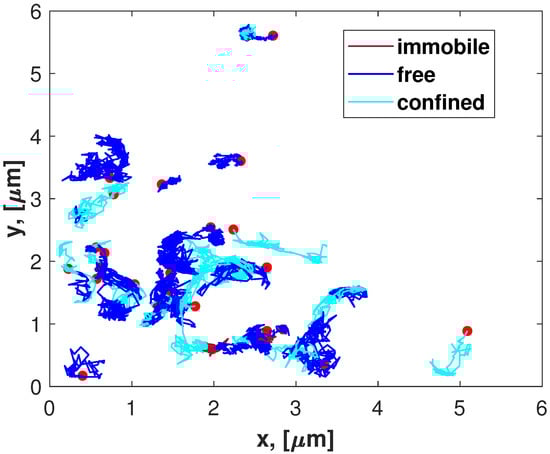 There are several ways for detecting the motion switch between different types of diffusion. Most transient study algorithms employ either a rolling analysis window [] or many-state hidden Markov models [], but each of them has its drawbacks []. To mitigate these drawbacks, a newly popular transient analysis algorithm—referred to as DC–MSS—has emerged. It includes three steps. The first step begins with calculating a local movement descriptor based on the maximum pairwise distance (MPD) between particle positions inside a window. The distance value reflects the extent of a molecule’s movement. The smallest value is typical for immobile diffusion, while the largest corresponds to the directed motion. Segments exhibiting confined and free diffusion fall within intermediate MPD values. Consequently, a rule like MPD (immobile) < MPD (confined) < MPD (free) < MPD (directed) detects switching between different diffusion types. The second step is that the track segments found before are classified, using the moment scaling spectrum analysis of single-particle displacements. In the last step, this algorithm verifies the possibility of merging adjacent segments, correcting the initial track oversegmentation. More information about the DC-MSS classification procedure and computer codes can be found in []. Knowing where each segment starts and ends, we can analyze them separately and investigate their statistical properties. However, this approach substantially increases the amount of additional information to analyze and extends the overall analysis time.
